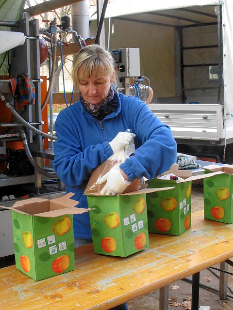 Schließlich wurden in einer Nachsammelaktion noch etwa 2,7 t gleich vor Ort von einer mobilen Saftpresse zu Saft in „Bag-in-Box“ verarbeitet.