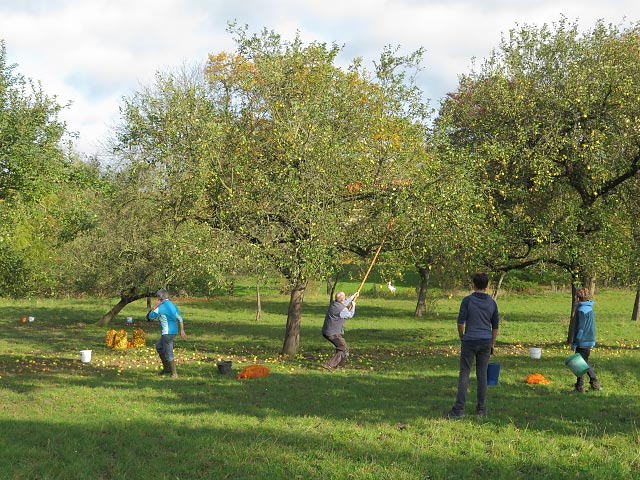 In diesem Jahr war unsere Apfelsammelaktion klein, aber fein: Wir haben an einem Oktoberwochenende mit wunderschönem Wetter auf 3 Wiesen Äpfel gesammelt. Obwohl im Frühjahr die Blüte erfroren ist und der Sommer viel zu viel Feuchtigkeit und zu wenig Sonne brachte, haben wir immerhin etwas über 5 Tonnen Äpfel gesammelt und den größten Teil davon in der Mosterei Armgart in Königslutter mit dem bereits gekauften philippinischen Mangomark zu Apfel-Mango-Saft verarbeiten lassen. Ein bisschen Apfelsaft blieb noch übrig zum Verkauf an die fleißigen Sammler und Helfer.